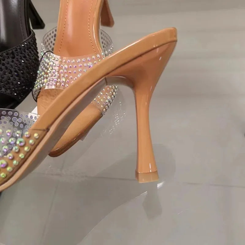 2025 Summer Ladies Sandals Pointed Open Toe High Heels Party Stilettos PVC Transparent Luxury Shining Diamond Woman Mules Shoes